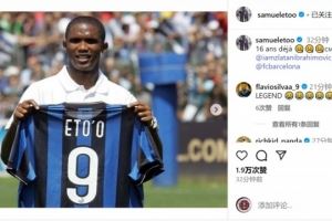 埃托奥社媒晒出自己与伊布当时互换东家的照片,配文:“16年前。”并@伊布、国米和巴萨。