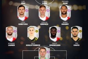 体育资讯10月18日讯 本轮德甲将上演焦点对决拜仁对阵多特,德甲官方也通过球迷票选评选出双方最佳11人阵容,其中凯恩领衔拜仁9人在列,具体如下: